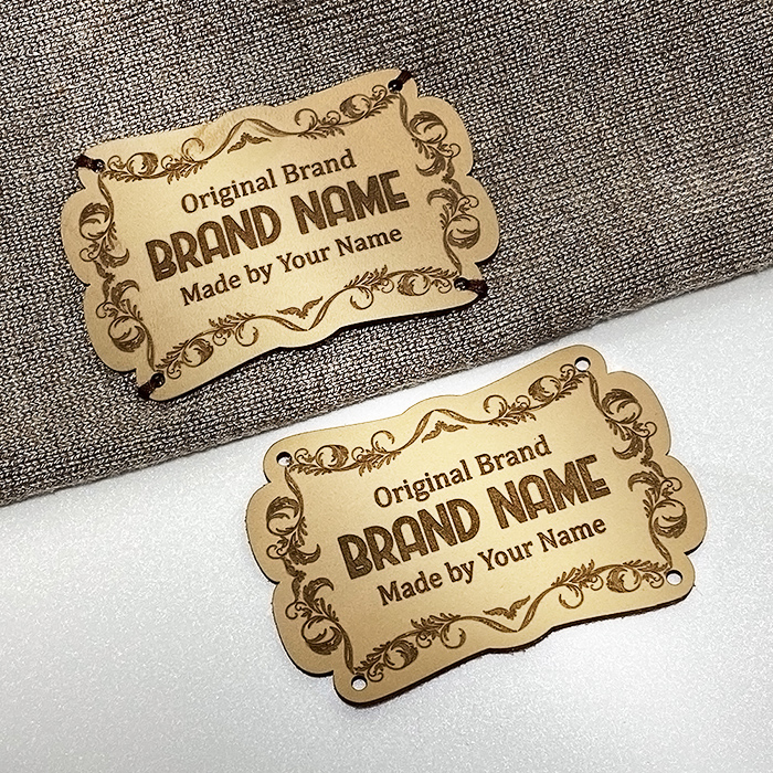 Προσαρμοσμένη ετικέτα από γνήσιο δέρμα, χαραγμένη με λέιζερ και κομμένη σύμφωνα με τις διαστάσεις που εμφανίζονται.