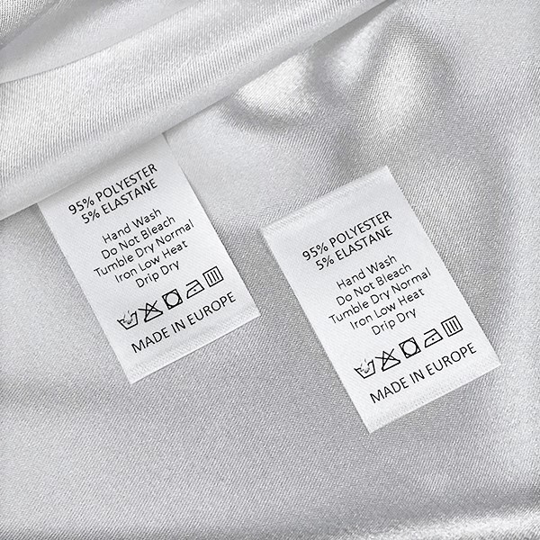 Ετικέτα περιποίησης ρούχων, με σύμβολα συντήρησης και πλυσίματος, προσαρμοσμένη με επωνυμία και σύνθεση υλικού, τυπωμένη σε λεπτό λευκό σατέν. Αυτός ο τύπος ετικέτας υφασμάτων κατασκευάζεται χρησιμοποιώντας τις πιο προηγμένες τεχνολογίες στον τομέα της ψηφιακής εκτύπωσης σε υφασμάτινη βάση. Οι ετικέτες τυπώνονται σε ειδικό σατέν με μέθοδο θερμικής μεταφοράς, με εντυπωσιακή ποιότητα εκτύπωσης και υψηλή αντοχή στο πλύσιμο.