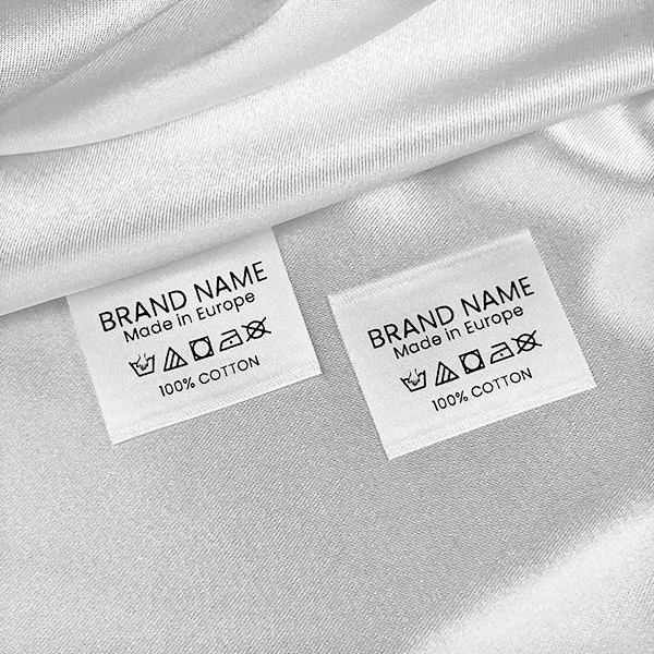 Ετικέτα υφασμάτων για ρούχα και αξεσουάρ ένδυσης, από λευκό σατέν, που περιέχει σύμβολα πλυσίματος και περιποίησης και σύνθεση υφάσματος. Αυτός ο τύπος ετικέτας υφασμάτων κατασκευάζεται χρησιμοποιώντας τις πιο προηγμένες τεχνολογίες στον τομέα της ψηφιακής εκτύπωσης σε υφασμάτινη βάση. Οι ετικέτες τυπώνονται σε ειδικό σατέν με μέθοδο θερμικής μεταφοράς, με εντυπωσιακή ποιότητα εκτύπωσης και υψηλή αντοχή στο πλύσιμο.