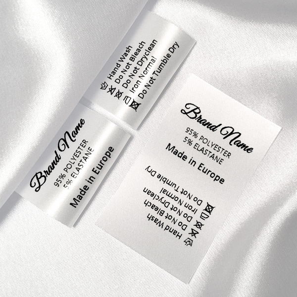 Ετικέτα φροντίδας ρούχων κατασκευασμένη σε λεπτό λευκό σατέν, προσαρμοσμένη με το εμπορικό σήμα, σύμβολα πλυντηρίου και οδηγίες πλυσίματος. Αυτός ο τύπος ετικέτας υφασμάτων κατασκευάζεται χρησιμοποιώντας τις πιο προηγμένες τεχνολογίες στον τομέα της ψηφιακής εκτύπωσης σε υφασμάτινη βάση. Οι ετικέτες τυπώνονται σε ειδικό σατέν με μέθοδο θερμικής μεταφοράς, με εντυπωσιακή ποιότητα εκτύπωσης και υψηλή αντοχή στο πλύσιμο.