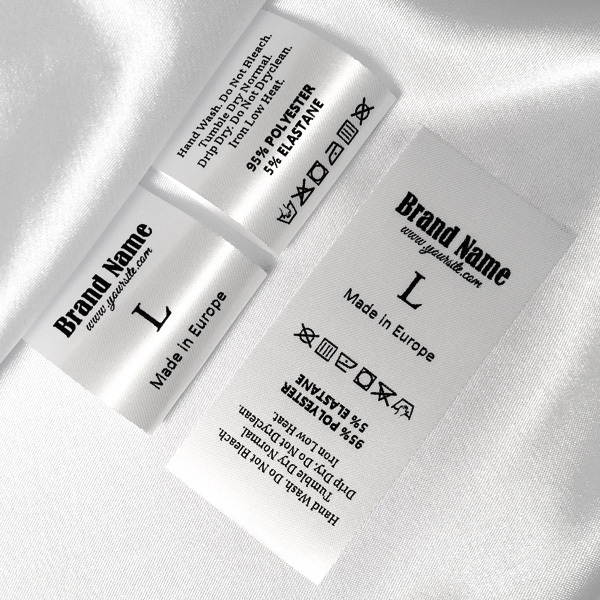 Σατέν ετικέτα περιποίησης ρούχων που περιέχει πληροφορίες μεγέθους, κείμενα, σύμβολα πλυντηρίου και οδηγίες πλυσίματος και το εμπορικό σήμα, κατάλληλο για ρούχα. Αυτός ο τύπος ετικέτας υφασμάτων κατασκευάζεται χρησιμοποιώντας τις πιο προηγμένες τεχνολογίες στον τομέα της ψηφιακής εκτύπωσης σε υφασμάτινη βάση. Οι ετικέτες τυπώνονται σε ειδικό σατέν με μέθοδο θερμικής μεταφοράς, με εντυπωσιακή ποιότητα εκτύπωσης και υψηλή αντοχή στο πλύσιμο.