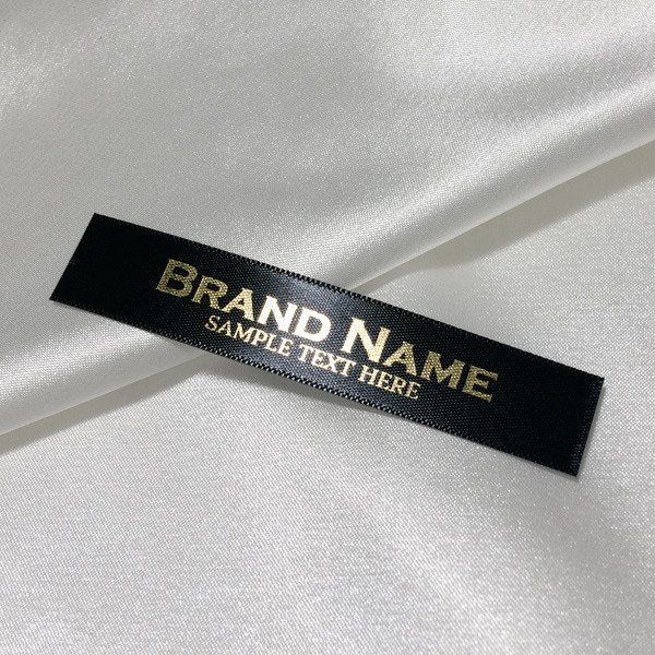 Ετικέτα υφασμάτινη τυπωμένη με προσαρμοσμένα κείμενα σε σατέν ύφασμα, κομμένη σύμφωνα με τις διαστάσεις που παρουσιάζονται.