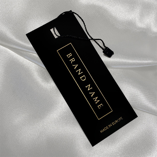 Κρεμαστή χάρτινη ετικέτα με χρυσή γραφή και μαύρο φόντο, που παρέχεται με κορδόνι για προϊόντα ένδυσης, κατασκευασμένη από χοντρό χαρτόνι Soft Touch πλαστικοποιημένο και στις δύο πλευρές. Αυτός ο τύπος κρεμαστής ετικέτας είναι κατασκευασμένος από υλικά υψηλής ποιότητας, χρησιμοποιώντας τις πιο προηγμένες τεχνολογίες στον τομέα της ψηφιακής εκτύπωσης και φινιρίσματος.