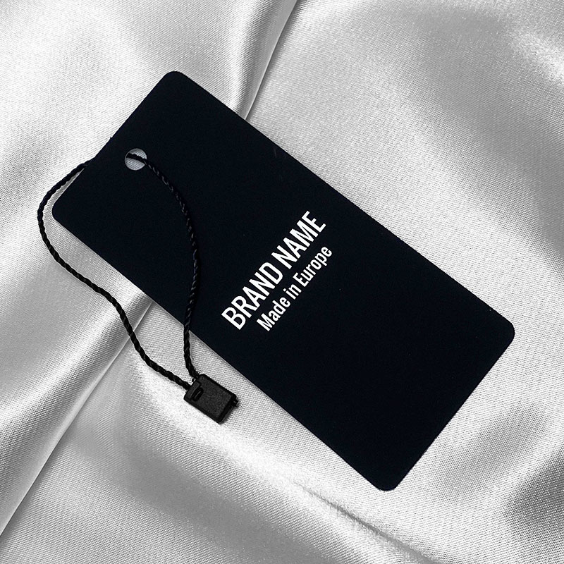 Κομψή ετικέτα ρούχων με κρεμαστό κορδόνι, κατασκευασμένη από μαύρο χαρτόνι, προσαρμοσμένη με ασημί κείμενο ή λογότυπο. Αυτός ο τύπος κρεμαστής ετικέτας είναι κατασκευασμένος από υλικά υψηλής ποιότητας, χρησιμοποιώντας τις πιο προηγμένες τεχνολογίες στον τομέα της ψηφιακής εκτύπωσης και φινιρίσματος.