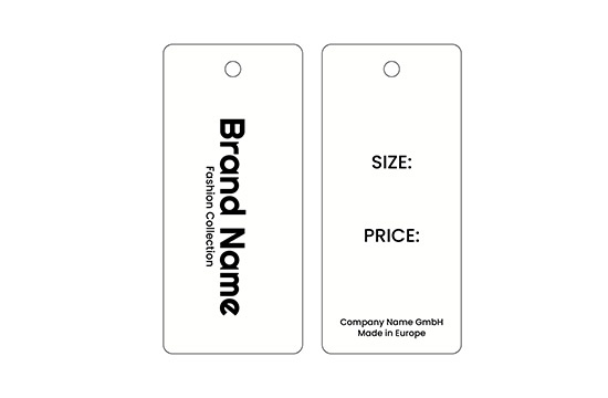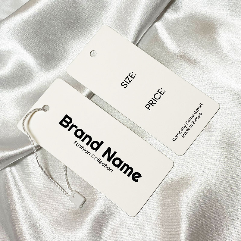 Χάρτινη ετικέτα με κορδόνι για ρούχα ή διάφορα αξεσουάρ ρούχων, εξατομικευμένη με επωνυμία ή λογότυπο, αλλά και άλλες πληροφορίες για το προϊόν, με τυπωμένες και τις δύο όψεις. Αυτός ο τύπος κρεμαστής ετικέτας είναι κατασκευασμένος από υλικά υψηλής ποιότητας, χρησιμοποιώντας τις πιο προηγμένες τεχνολογίες στον τομέα της ψηφιακής εκτύπωσης και φινιρίσματος.
