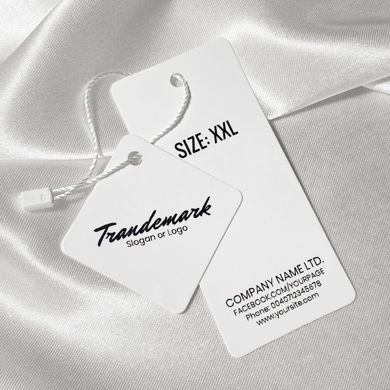 Χάρτινες ετικέτες για ρούχα με λευκή σφράγιση, κατασκευασμένες από χοντρό πλαστικοποιημένο χαρτόνι με γυαλιστερό φύλλο και εξατομικευμένες με κείμενο ή λογότυπο. Αυτός ο τύπος κρεμαστής ετικέτας είναι κατασκευασμένος από υλικά υψηλής ποιότητας, χρησιμοποιώντας τις πιο προηγμένες τεχνολογίες στον τομέα της ψηφιακής εκτύπωσης και φινιρίσματος.