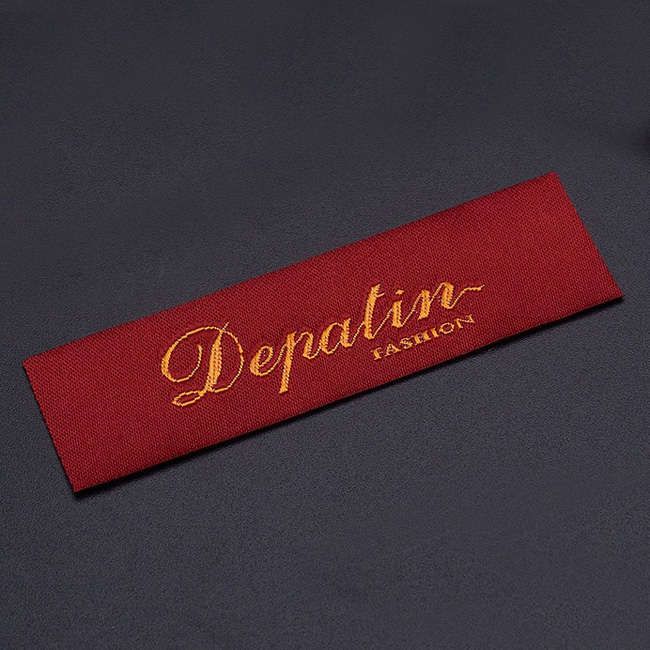 Υφαντή ετικέτα προσαρμοσμένη με κεντημένες επιγραφές, με ορθογώνιο σχήμα και διπλωμένες άκρες.